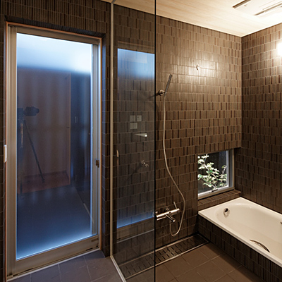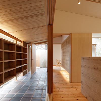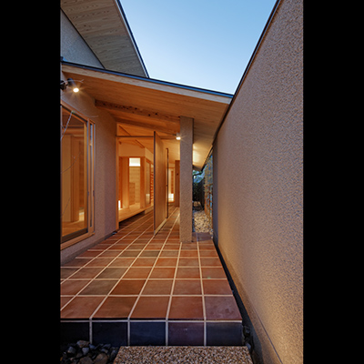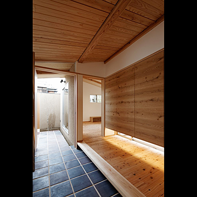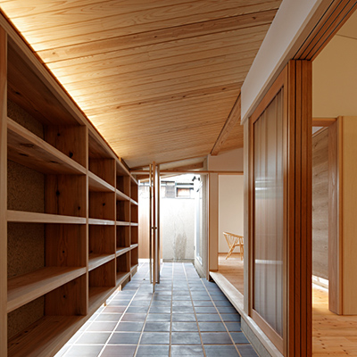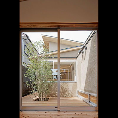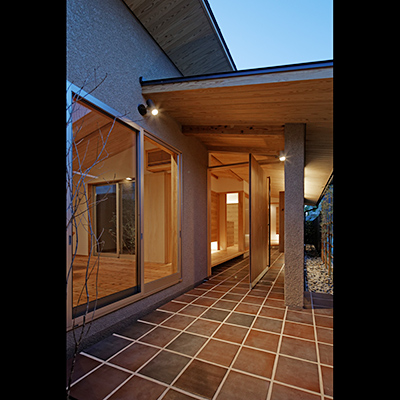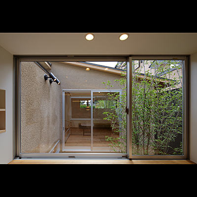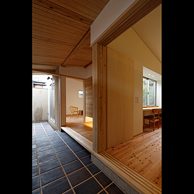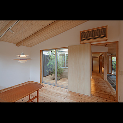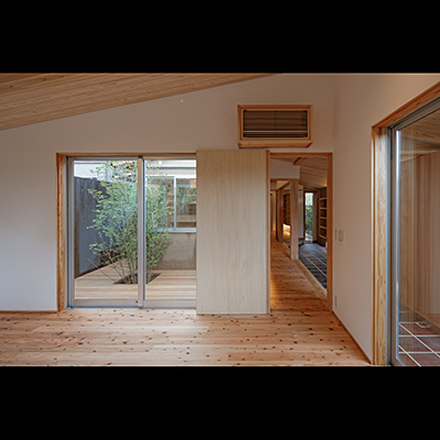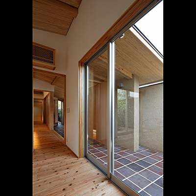 プランは土間空間があり抜けており、中庭にも連続し、空間の広がりや光や風を取込む構成となっている。