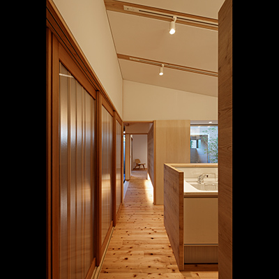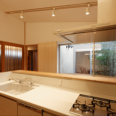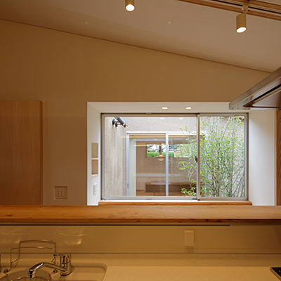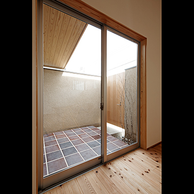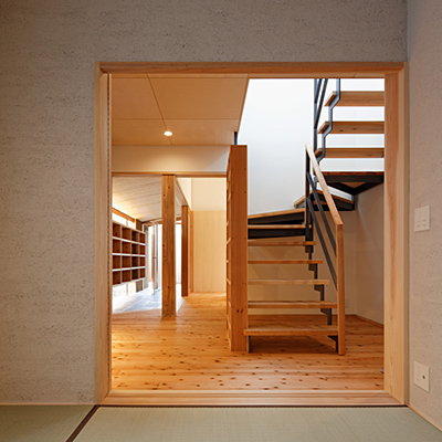 階段横の前室も同様の役割をしている。家族室と食事室・台所は中庭を介し程良い距離感でつながっている。