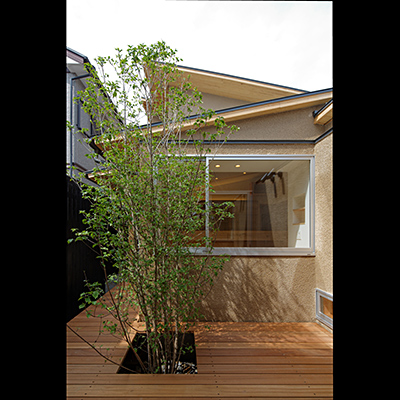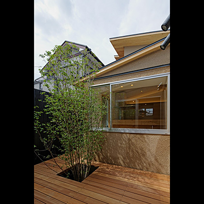 前面道路にはシンボルツリーを植えた前庭(駐車場)を配し、まちに対して馴染ませている。