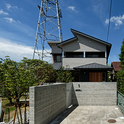 外構は杉板型枠コンクリート打放しの塀と植栽、背景の鉄塔を借景にしたデザインとした。