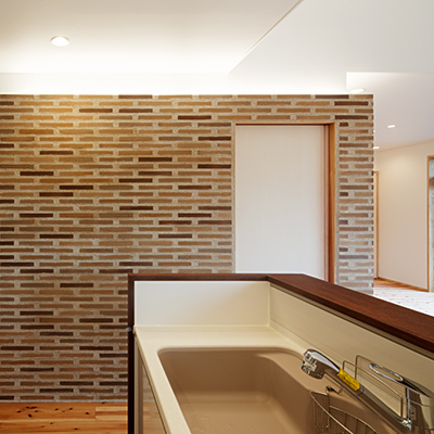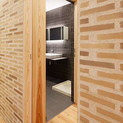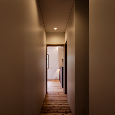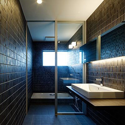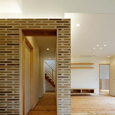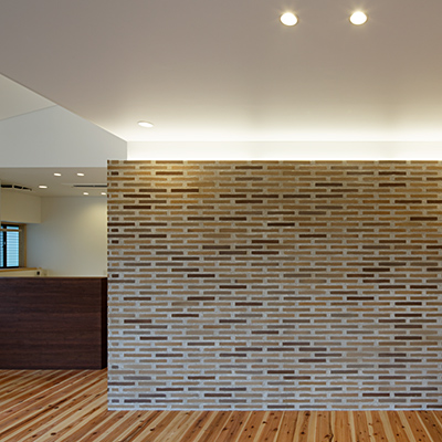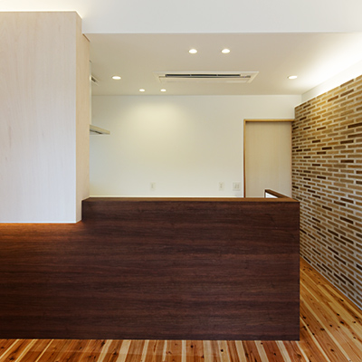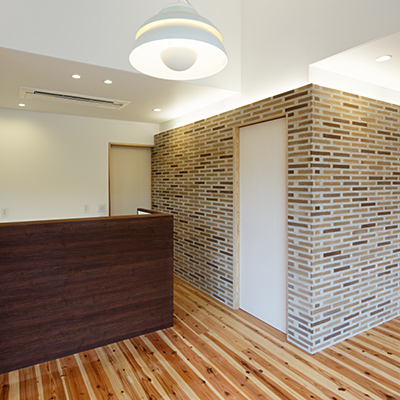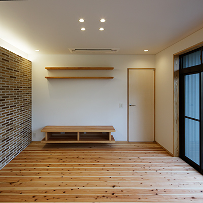 その他の部屋をレンガタイル張のBOXに見立てて、強調させるために間接照明を入れ室内を照らしている。